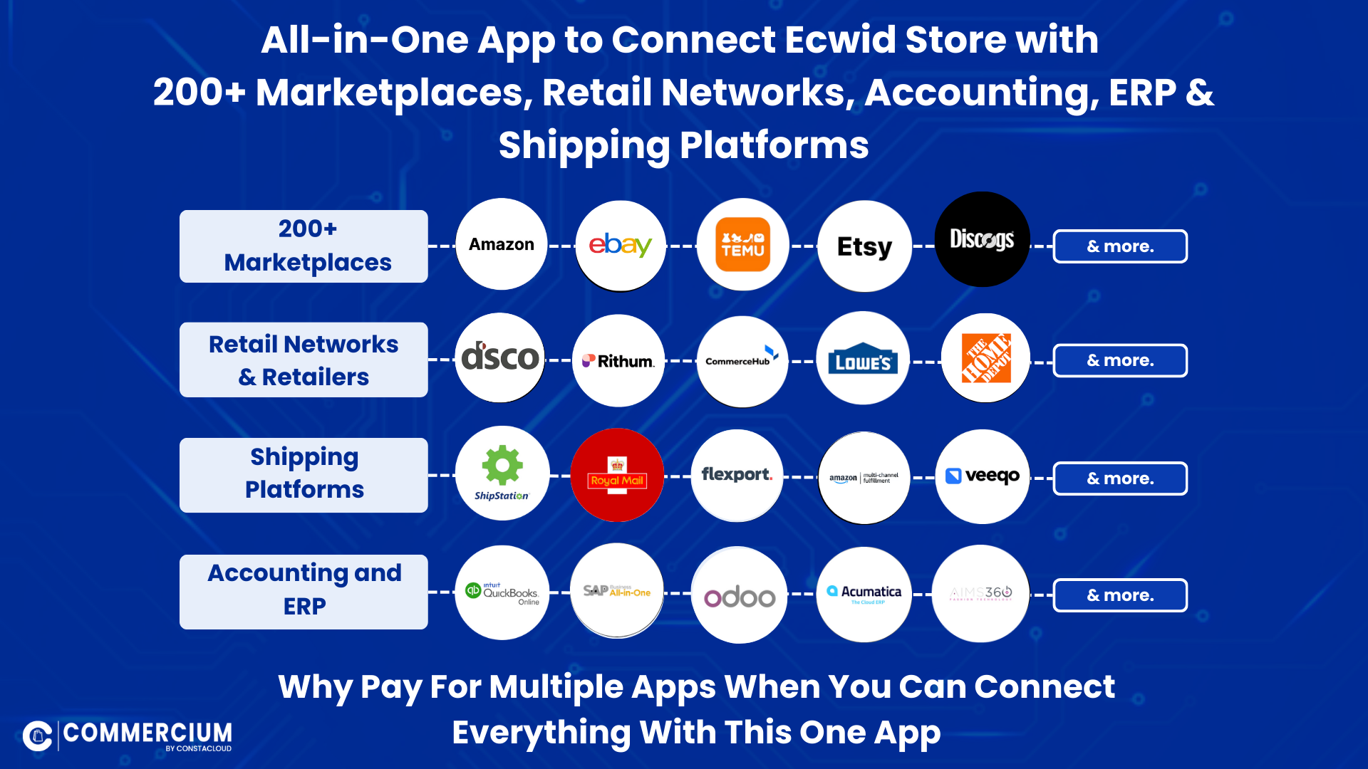 Commercium is an all-in-one integration platform designed to streamline multichannel operations. It helps you connect your Ecwid store with 200+ marketplaces like Noon, Mirakl, Amazon, Temu, Shein, Kogan, Whatnot, Discogs, Flipkart, Iconic, The Range, Backmarket, Bandcamp, B&Q, Galaxus / Digitec, Wayfair, OnBuy, Farfetch, eBay, TikTok Shop, Reverb, Not On The High Street (NOTHs), CDiscount, Fruugo, Abebooks, Emag, Faire, Vivino, Walmart, Refurbed, Gunbroker, Groupon, Target Plus, Poshmark, Zalora, Jumia Vendor, Trademe, CDON, Miravia, Lazada, Etsy, and more.