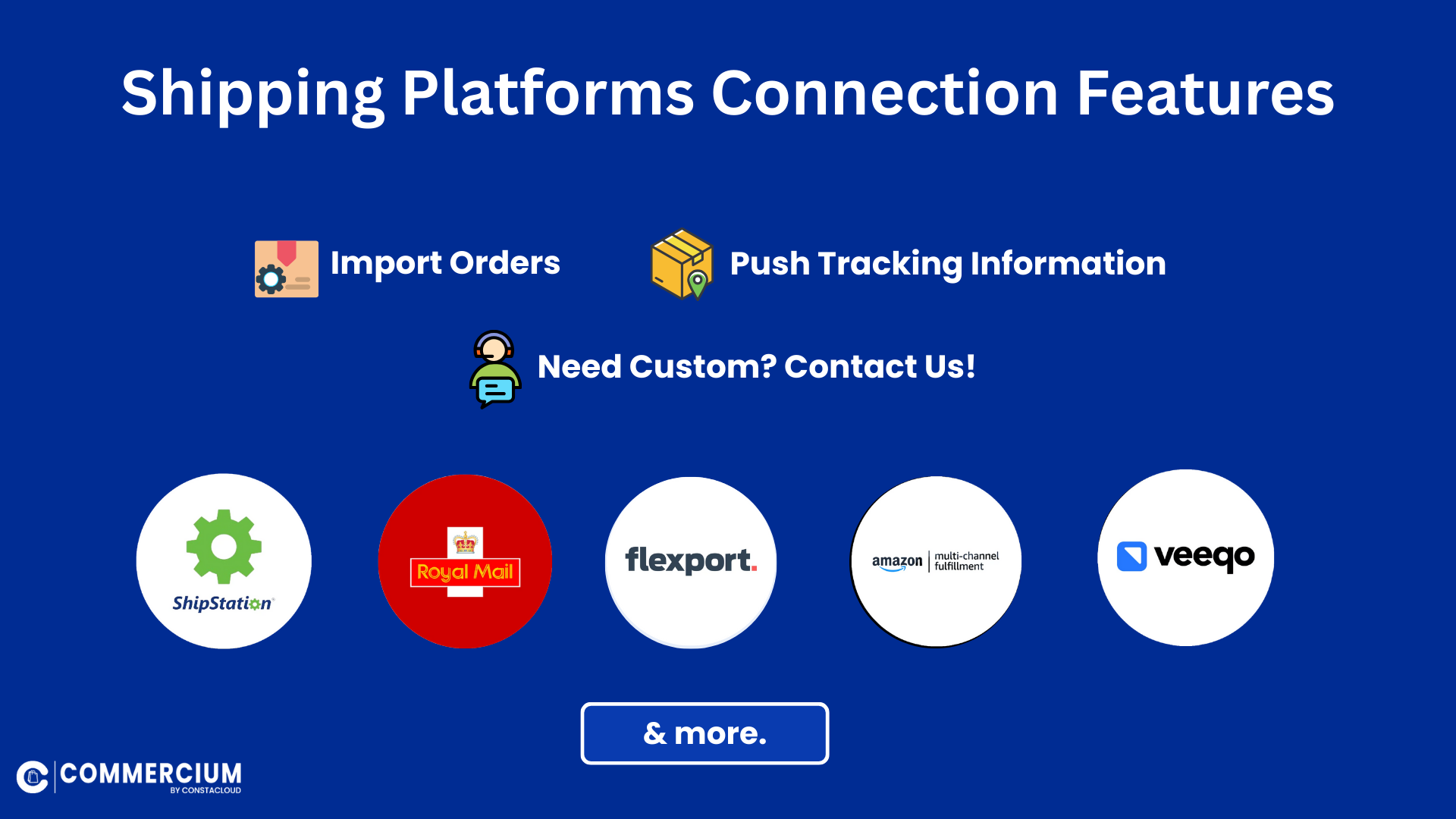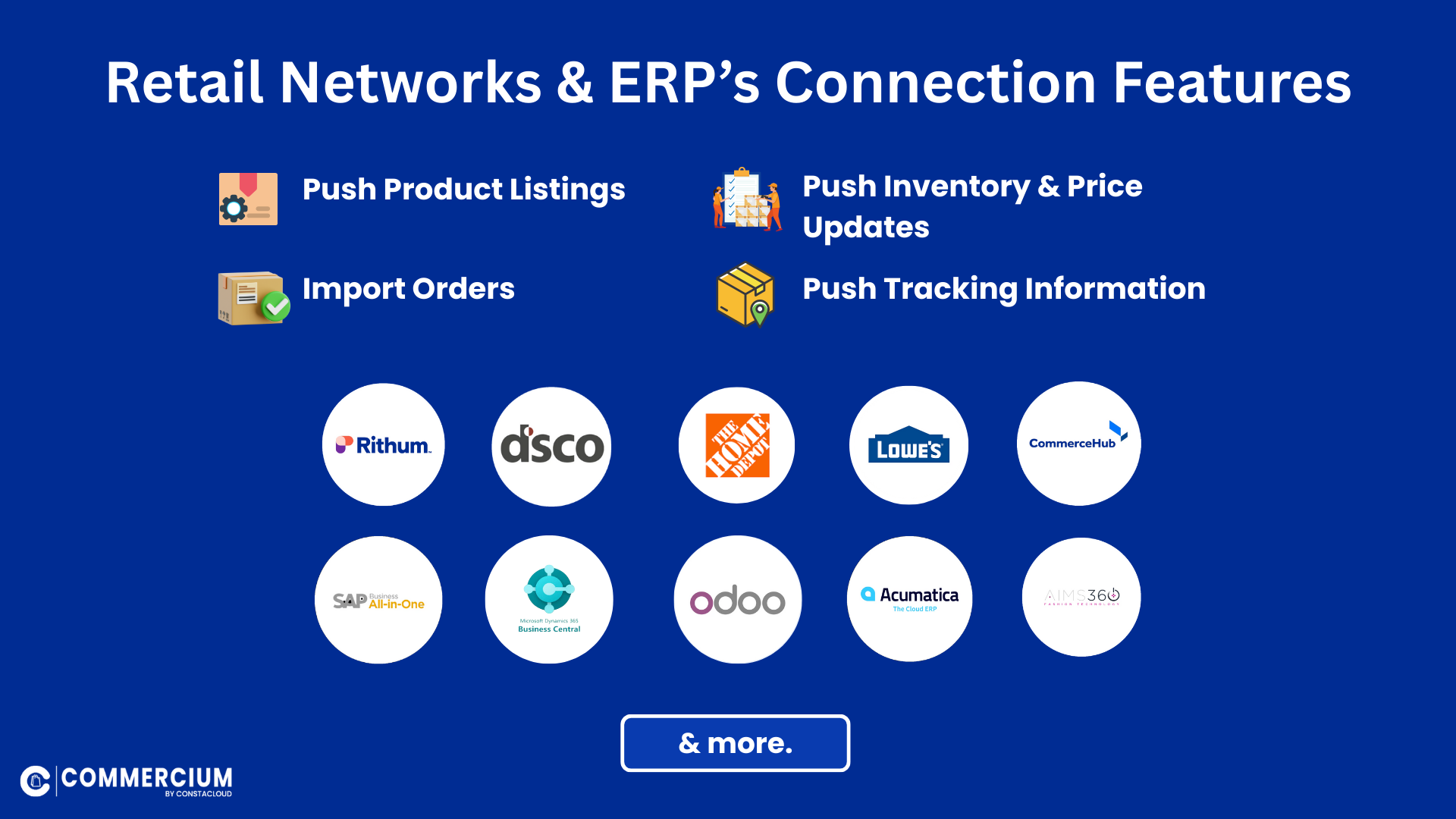 Along with leading retailer networks such as CommerceHub / Rithum / Dsco, Rithum / OrderStream, Lowes, and Home Depot. As well as accounting and shipping tools, including QuickBooks Online, ShipStation, Royal Mail, Flexport, Amazon MCF, Shiphero, and more. You can also connect with ERP tools, including SAP B1, Acumatica, MS Dynamics Business Central, Odoo, and Aims 360. All are using just one connector. Why pay for multiple connectors when you can manage everything with Commercium?