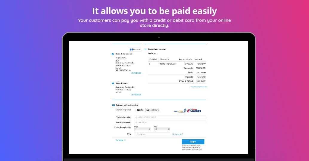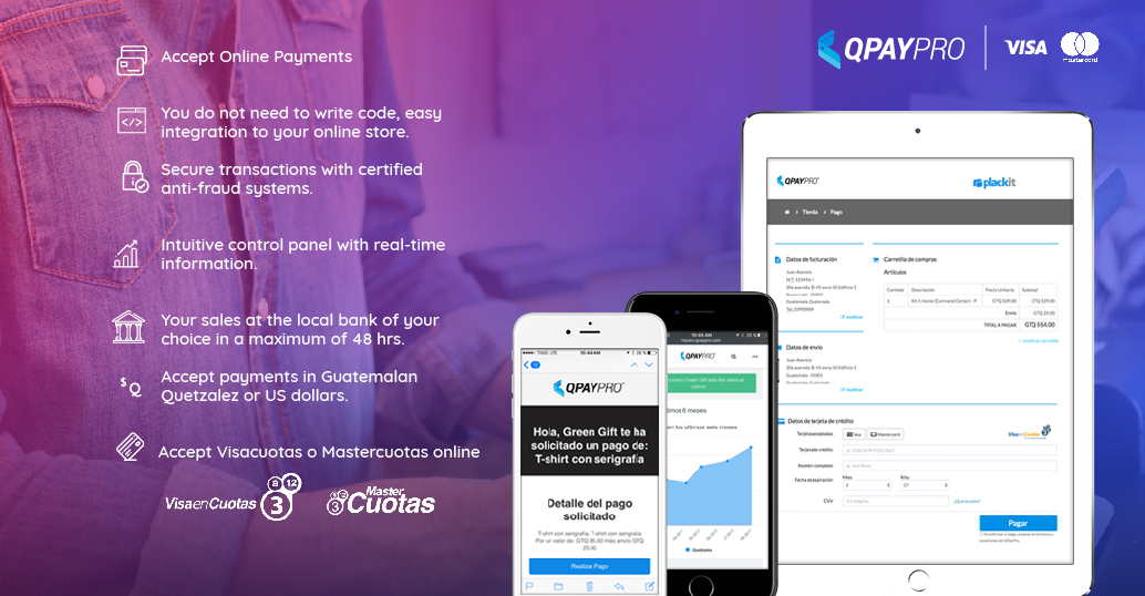 QPayPro is an online payment gateway for credit and / or debit cards in Guatemala that allows you to increase your sales by accepting an easy, fast and secure payment method. QPayPro easily integrates with your online store, social networks, email, etc.