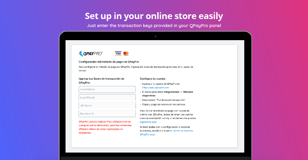 • Easily configure in your online store, just enter the transaction keys provided by QPayPro from your control panel.