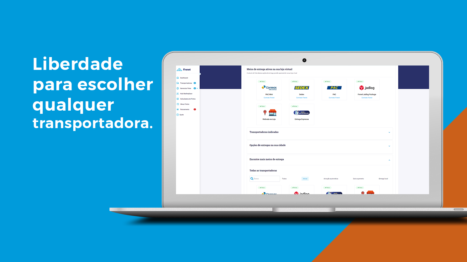 A Frenet dá liberdade de conectar sua loja virtual a qualquer transportadora, motoboy e Correios para vender mais.