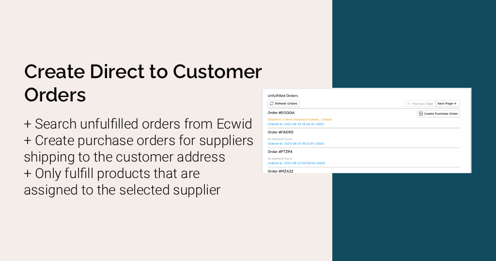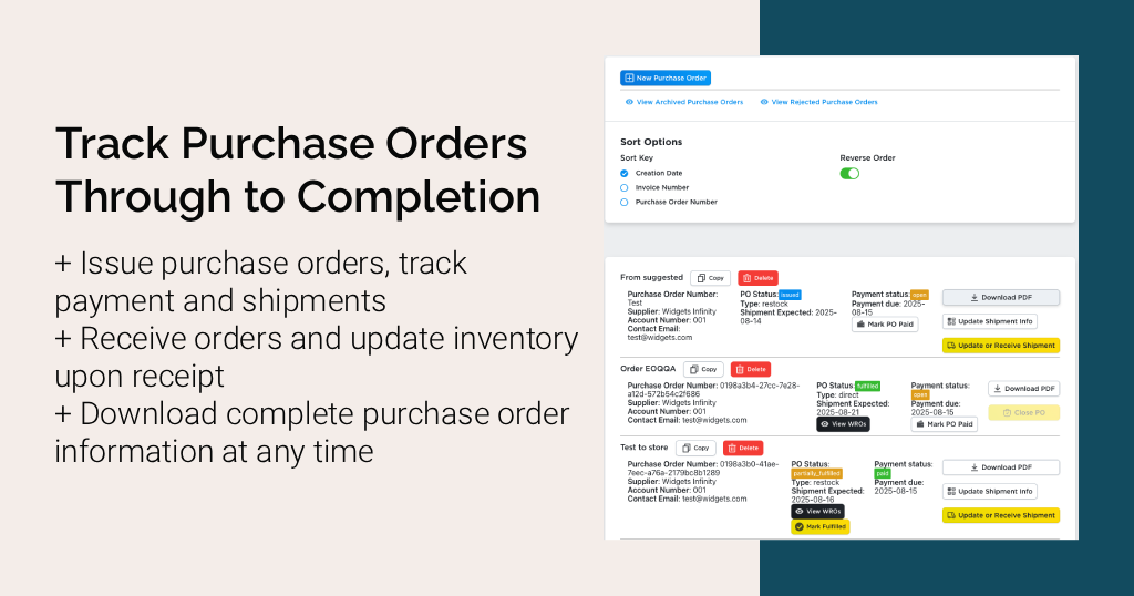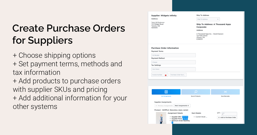 Manage your inventory by tracking your suppliers, tracking pricing, supplier SKUs and specific ordering requirements, based on your store’s product data. Create and download purchase orders directly from this information, and manage those purchase orders, all in one app, and without duplicated product information.