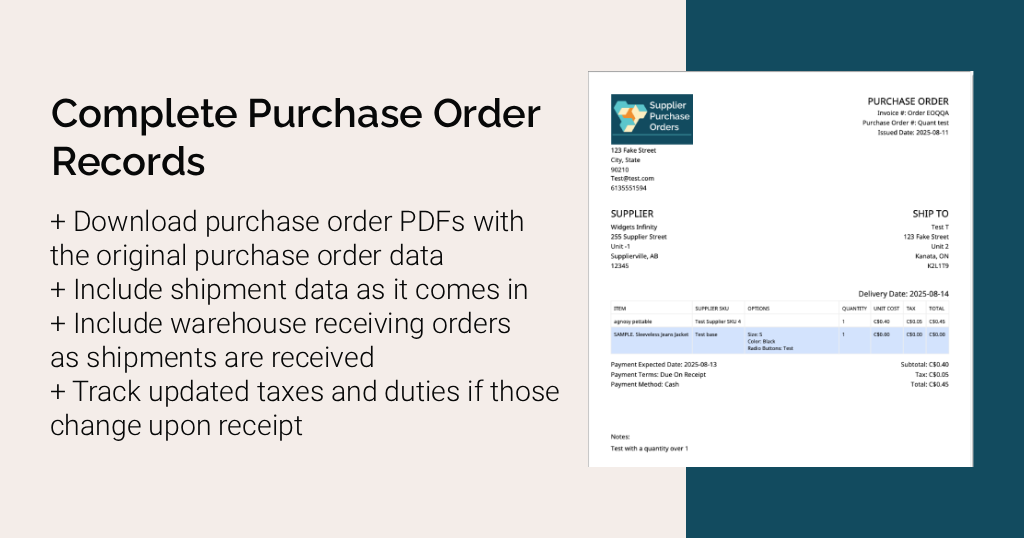 While open, you can associate taxes, duties, shipment costs and shipment information with your purchase orders. Downloading PDFs for your purchase orders includes all of this information, so you’ll always have all of your purchase order information in one easily accessible place.