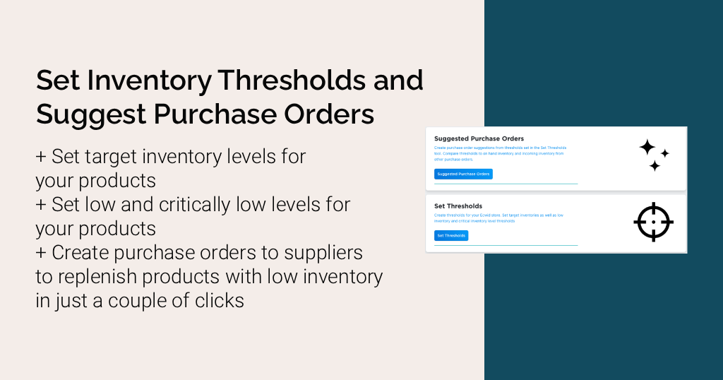 Set up inventory target thresholds, with low and critically low thresholds. With just a few clicks, you can then generate suggested purchase orders for suppliers to bring your low inventory back up to your set targets.